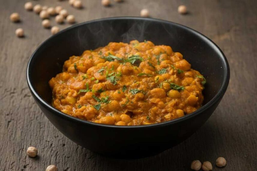 Chickpeas simmered in a rich, spiced and rich tomato-onion gravy.