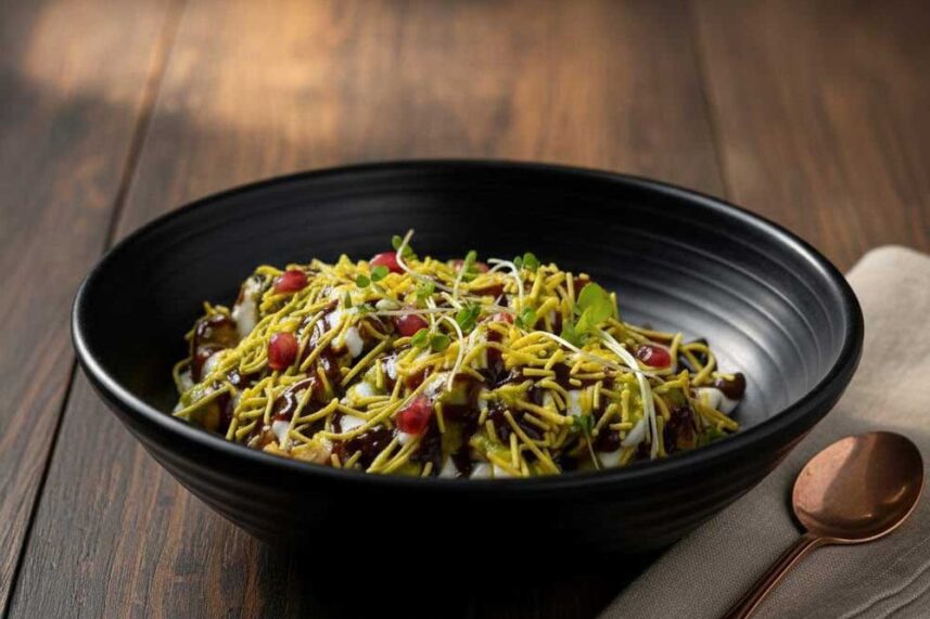 Crispy samosas topped with chickpeas, chutneys, yogurt, and spices.