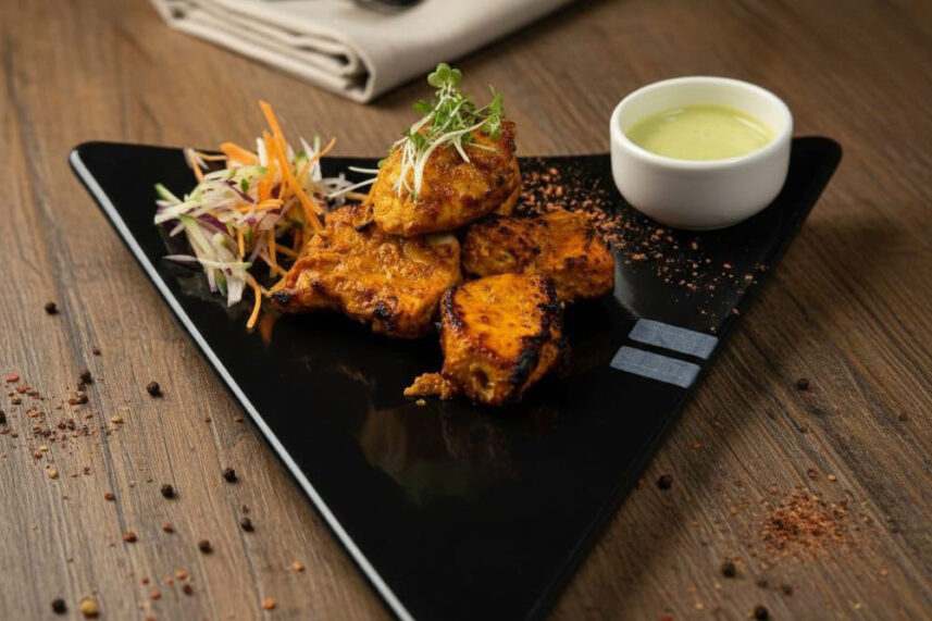 Boneless chicken marinated in yogurt, ginger, garlic, and grilled spices.