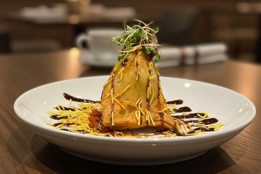 Crispy pastry filled with spiced potato and peas, served with tamarind and mint chutney.